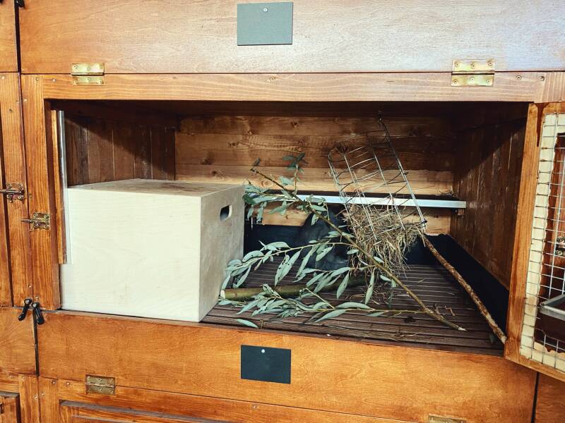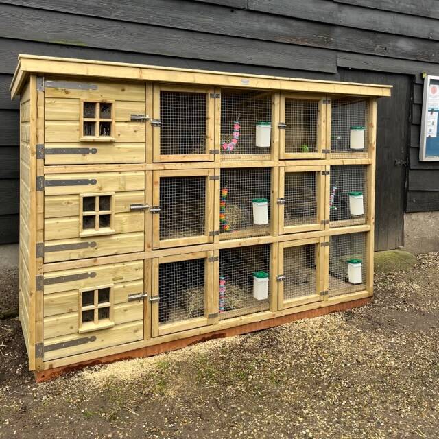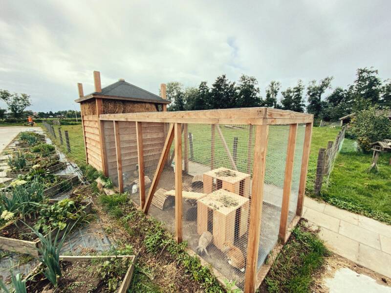 Alle konijnen die niet in de ren of hooiberg leven, wonen in ruime hokken met een oppervlakte van minimaal 1 m2 per konijn. Alle moederkonijnen en hun jongen beschikken over een verblijf van 3-6m2 bij hun gastgezin. Er wordt daarnaast altijd gezorgd voor voldoende knaagmateriaal en ander speelgoed, zoals bijvoorbeeld wilgentakken. Op die manier hoeven de konijnen zich niet te vervelen. De bodem van deze hokken bestaat uit diervriendelijke vlonders van kunststof. De uitwerpselen van de konijnen vallen door deze vlonders naar beneden, waardoor de konijnen nooit in hun eigen uitwerpselen hoeven te lopen. Dit is hygiënisch en verlaagt de kans op ziekten. De konijnen hebben wel een 'graafbak' in hun verblijf met bodembedekker, zodat ze toch de mogelijkheid hebben om te kunnen graven. Tot slot heeft ieder verblijf een verhoogde zitplank, zoals te zien is op de afbeelding. Hier kunnen de konijnen op en af springen en heerlijk op relaxen, zoals te zien op de foto!